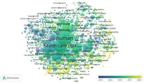 Bibliometric analysis was carried out with VOSviewer_1.6.17 toolkit [3] to clarify the general contextual directions of scientific research aimed at identifying the relationship between healthcare expenditure and sustainable economic growth. This theoretical block of research was realised based on 1294 Scopus [4] papers, the title, abstract, or keywords of which contain such words as “health”, “expenditure”, and “sustainable”.