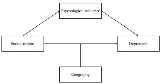 The study examined the influence of social support on depression, including the mediating role of psychological resilience and the moderating role of geography. Questionnaires were completed by 424 economically disadvantaged college students in two provinces, X, a coastal province, and Y, an inland province. The results indicated that (1) the social support of economically disadvantaged college students was positively correlated to psychological resilience (β = 0.62, t = 11.22, p < 0.001); (2) the psychological resilience of economically disadvantaged college students was negatively correlated with depression (β = −0.24, t = −10.3, p < 0.001); (3) the social support of economically disadvantaged college students was negatively correlated with depression (β = −0.08, t = −2.85, p < 0.001); (4) the psychological resilience of economically disadvantaged college students played a partial mediating role between social support and depression; and (5) geography played a moderating role in the effect of social support on depression.