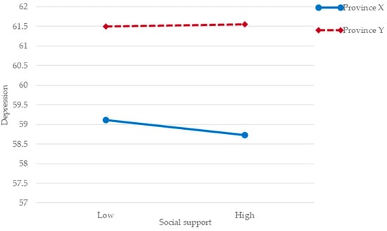 This study also found that the geography of economically disadvantaged college students moderated the effect of social support on depression. The results of the moderating effect test showed that social support was a significant negative predictor of depression for subjects from coastal province X. For subjects from an inland province Y, social support was not a significant negative predictor of depression for economically disadvantaged college students. Social support for economically disadvantaged college students from an inland province Y did not work well to mitigate and prevent psychological disorders caused by stressful life events and protect psychological health [37,38].