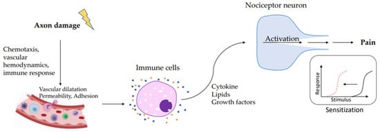 During axon damage, neuronal factors released from nociceptor sensory neurons directly drive leukocyte chemotaxis, vascular hemodynamics, and the immune response. Immune cells release mediators that are detected by receptors of the nociceptor peripheral nerve that transduce the stimuli to produce pain sensitization.