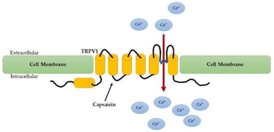 With the activation of capsaicin-sensitive nerve terminals, several sensory neuropeptides, such as substance P, neurokinin A, and calcitonin gene-related peptide that lead to vasodilation and inflammatory cell recruitment (neurogenic inflammation) [,,,,] and have a potent anti-inflammatory and antinociceptive action, are released. The long exposure to capsaicin and subsequent desensitization of the receptor may be explained by the death of the nociceptor or the destruction of its peripheral terminals [,,,]. Capsaicin can provoke the perception of pain through its action on nociceptors, which may mimic the action of a physiological stimulus or an endogenous ligand produced during tissue injury [].