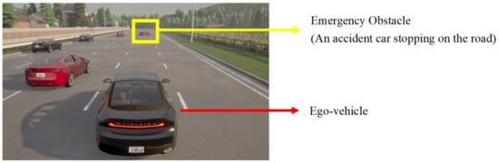 The driving scenario relied on Carla to create a highway. The highway was a one-way, five-lane highway, with each lane being 3.5 m wide. The simulated scenario generated a random traffic flow ranging from 0 to 30 vehicles/km, with the speed of the random traffic flow set at 60 km/h. Assuming that the automated driving vehicle was always cruising in the second lane at 88 km/h, the vehicle needed to be switched from automated driving to manual driving upon receiving a prompt from the system to circumvent the obstacle vehicle in a collision-free status, as shown in