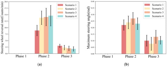 Figure 5 shows the steering wheel reversal rate, and the maximum steering angle for each phase of the driver in different scenarios. Phase 1 is the driver’s reaction phase, during which the driver had no steering wheel control. The driver’s control of the steering wheel was mainly concentrated in Phase 2. It can be seen from Phase 2 that the steering wheel reversal rate in Scenario 1 (AVG. = 8.9) was significantly lower than the other three scenarios (Scenario 2: AVG. = 13.8; Scenario 3: AVG. = 14.1; Scenario 4: AVG. = 14.6). Meanwhile, the higher the scenario urgency, the greater the standard deviation of the steering wheel reversal rate (Scenario 1: S.D. = 2.02; Scenario 2: S.D. = 2.63; Scenario 3: S.D. = 3.44; Scenario 4: S.D. = 3.97). The maximum steering angle showed a trend of “increasing-decreasing” (Scenario 1: AVG. = 0.22; Scenario 2: AVG. = 0.24; Scenario 3: AVG. = 0.27; Scenario 4: AVG. = 0.23). It can be seen from Phase 3 that the steering wheel reversal rate declined from Scenario 1 to Scenario 4 (Scenario 1: AVG. = 3; Scenario 2: AVG. = 2.3; Scenario 3: AVG. = 2; Scenario 4: AVG. = 1.8). The maximum steering angle in different urgency scenarios shows a discrete trend.