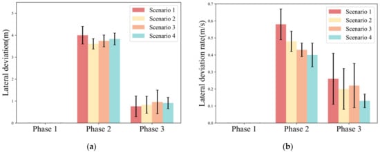 In Phase 3, there is no significant change in lateral deviation among the four scenarios (AVG. = 0.76~0.96). The trend of the lateral deviation rate is similar to that of Phase 2. The lateral deviation rate decreases with the increase in urgency. Meanwhile, the standard deviation of the lateral deviation rate under Scenario 4 is significantly smaller than that of the other three scenarios.