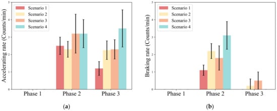 In Phase 3, the accelerating rate increases with urgency (Scenario 1: AVG. = 1.2; Scenario 2: AVG. = 2.3; Scenario 3: AVG. = 2.2; Scenario 4: AVG. = 3.6). However, braking behavior is almost absent in Phase 3, and the mean value of the braking rate in Scenario 3 is only 0.45 counts/min.