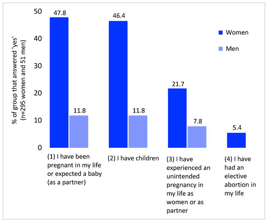 The study group paired questions on similar topics into four domains, reproductive history, reproductive decision making, parenting, and sexuality. Reproductive history was reported separately for respondents identifying as women and men. History of abortion was presented for respondents identifying as women. The results of multiple-choice questions were presented in graphs. Open-text answers that elaborated on multiple choice answers (‘if yes, why?’) were collected and included in the results’ section to illustrate the findings. Respondents’ answers were not cited, nor did we calculate the number of reasons provided by the respondents.
