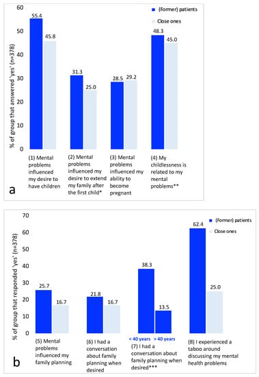 ((a), questions 1–4) and ((b), questions 5–8) Panel’s responses to questions about mental health problems in relation to reproductive decision-making and experiencing taboo. * Proportion of respondents with children (n = 151). ** Proportion of respondents without children (n = 227). *** Proportions of (former) patients with age <40 years (n = 107) and age >40 years (n = 235).
