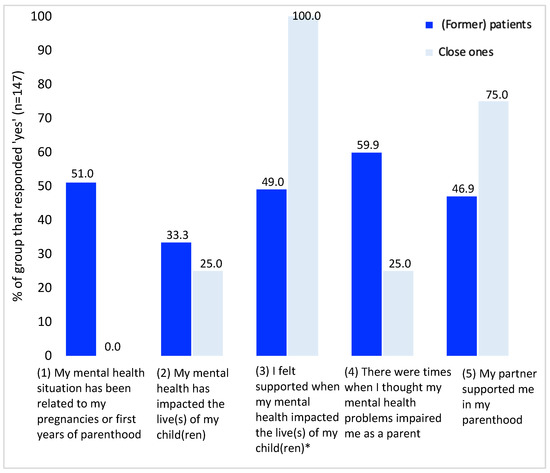 In total, 151 respondents (4 close ones and 147 (former) patients had children or reported for a person with children (in the case of close ones)). Figure 3 displays views on the influence of mental health on parenting and early parenthood. Supplementary Table S3 provides all raw data supporting Figure 3.