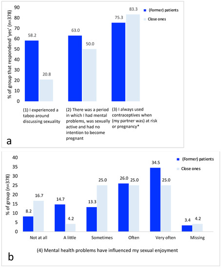 ((a), questions 1–3) and ((b), question 4) Panel’s responses to questions regarding mental health and sexuality. * Results for 223 (former) patients and 12 close ones who responded ‘yes’ to question (2).