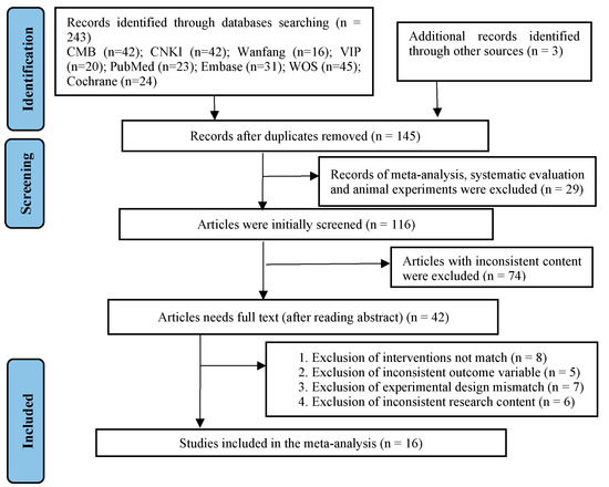 Two researchers (JQ.Y and M.Y) searched and screened the database according to title, abstract, and full text. Altogether, 246 articles were identified, 243 by searching in various databases and 3 supplementary articles through manual retrieval. After importing the literature management software EndNote X9 to remove duplicate literature, a total of 145 articles were included. After reading the literature titles and abstracts, 103 irrelevant articles were excluded, leaving 42 articles, and after further reading the full text, 26 articles were excluded. Therefore, finally 16 articles on RCTs were included in meta-analysis (Figure 1). Table 1 displays the characteristics of the included studies.
