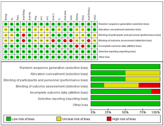 The methodological quality of the included studies was evaluated according to the Cochrane Version 5.1.0 tool. See Figure 2 for the included studies’ bias risk summary chart and the bias risk assessment chart. All the 16 included RCT studies [20,21,22,23,24,25,26,27,28,29,30,31,32,33,34,35] described the method of generating a random sequence. Only eight research reports used allocation concealment [22,27,29,30,31,32,33,34], and the other eight research reports did not elaborate on the allocation scheme [20,21,23,24,25,26,28,35]. Three studies [26,27,32] carried out the double-blind method, four studies [30,31,33,34] carried out a single-blind method, and other studies did not elaborate on this aspect. All study outcome indicators were complete, and there was no selective reporting.