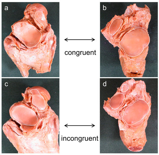 Procedure for assessing joint congruence. (a,c) Plantar aspect of the right talus; (b,d) dorsal aspect of the right calcaneus. Joint congruence was evaluated based on whether the number of articular facets of the talus and calcaneus were the same or different based on the classification of the number of the articular facets. The same number of articular facets for both talus and calcaneus were considered to represent congruence (a,b) and a different number represented incongruence (c,d).