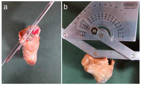 Procedure for measuring the intersecting angle. (a) Dorsal view of the right calcaneus; (b) Anteromedial view of the right calcaneus. The intersecting angle was measured by placing the protractor just above the articular facet of the calcaneus and measuring the angle between the AF and MF.