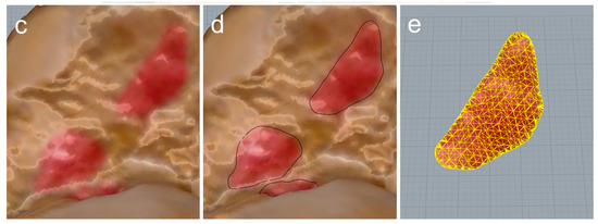 Procedure for measuring footprint area. (a) Site of attachment of the cervical ligament, interosseous talocalcaneal ligament, and anterior capsular ligament: right foot, dorsal view; (b) after detaching ligaments from bones, detached areas were colored with a pen to identify the footprint for each ligamentous attachment; (c) a three-dimensional (3D) scanner was used to create 3D models of the talus and calcaneus; (d) a curve was drawn on the boundaries of the footprint using a pen-type device; and (e) the footprint area was then calculated using Rhinoceros7 3D software.