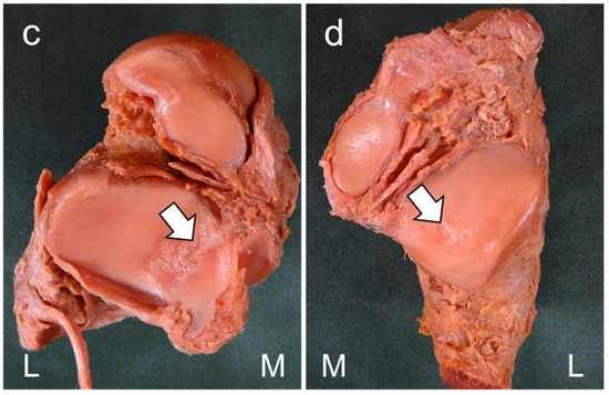 Procedure for assessing degeneration of the subtalar articular facet. (a,c) Plantar view of the right talus; (b,d) dorsal view of the calcaneus. arrow: areas showing degeneration of the subtalar articular facet. M: medial side; L: lateral side. Joints showing degeneration of any of the articular facets of the talus, calcaneus, or both were assigned to the Degeneration (+) group. Joints with no degeneration of the talus or calcaneus were assigned to the Degradation (−) group.