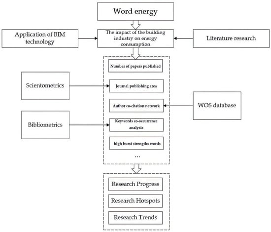 In recent years, scientometrics has gradually become one of the common methods used by researchers and universities to evaluate scientific research performance. This work adopts the method of bibliometric analysis and scientometric analysis. Firstly, the appropriate database and related literature are selected through bibliometric analysis, and then the scientific econometric analysis is carried out. Before the scientometric analysis, the significance of bibliometric analysis is to evaluate the relevant journals and find the appropriate literature, so as to make the results of scientometric analysis more credible. The present study will use scientometrics methods to analyze the application of BIM technology in the field of building energy consumption. Based on series analysis, the research hotspots, the most updated research, and historical changes of the use of BIM in the field of building energy consumption will be analyzed. The research process adopted in this paper is shown in Figure 1.