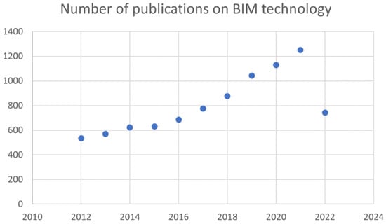 As shown in Table 3 and Figure 5, the number of publications related to the topic of BIM has clearly increased since 2012 as a result of the expanding use of BIM technology in engineering practice and the ongoing promotion of various software solutions. Every year from 2016 to 2019 saw the publication of more than 600 journal articles, and this trend was maintained until 2019. It indicates that the research on BIM has entered a stage of rapid growth [].
