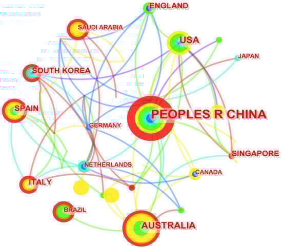 At the same time, the number of relevant studies published in different countries is derived from the WOS database and listed in Table 4. The table shows that the top countries are China, the United States, Australia, Spain, South Korea, and Italy, demonstrating that these nations have contributed significantly to the field’s research. The United States was the first to carry out relevant research in 2011 and took second place in the number of papers that have been published, while China started relatively late and started relevant research in 2014. However, the number of published papers in recent years is so large that it has reached the first place. The number of relevant articles in these countries/regions is considerable, indicating that these countries/regions have carried out in-depth studies on the use of BIM technology in building energy.