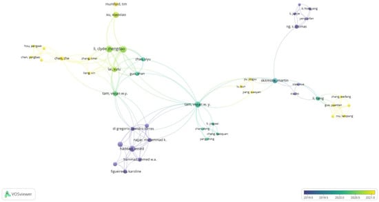 Several closely linked partitions in Figure 7 are colored to indicate that there has been a strong collaborative relationship among the authors in these partitions, such as Haddad Assed, Mohammed K and Ahmed W.A, Lai Xulu, Li Zhengdao, and Xu Xiao Xiao. The central authors of these partitions can also be determined by analysis. The central authors of the study group are more cooperative than other researchers. For example, Thomas is the central author of a research group that includes Li Junjie, Yang Yifan, and Li Hongyang. In addition, the first four central authors are all from developed countries, although more authors from different regions can be found as the list of authors continues []. The diversity of the authors’ locations can prove that the application of BIM technology in the field of building energy consumption has received worldwide attention.