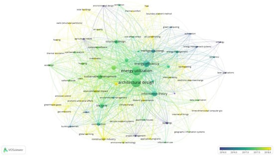 According to Figure 8, the top five keywords in frequency are architectural design, energy utilization, energy efficiency, sustainable development, and information theory. The published literature on BIM technology in the area of energy consumption analysis uses these keywords most frequently, and they are also related to one another.