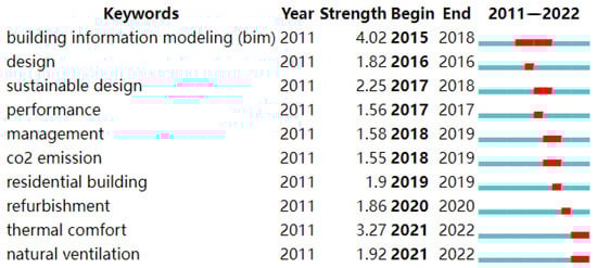 Figure 9 shows the top ten most powerful highlighted keywords, with red on the graph indicating that the keywords were highlighted during this period. The keywords are from 2011 to 2022, and in a short amount of time they have attracted much interest from the architectural science community. Words such as “BIM”, “thermal comfort”, and “sustainable design” are the most popular research hotspots in this research field. At the same time, thermal comfort and natural ventilation began to explode in 2021. There is no indication of whether the four words’ explosion phase will end. Since the data only cover research up to the end of March 2022, it is obvious that these two words’ explosion cycle will continue. As a result, it is possible to identify these keywords as the popular ones in the field of building energy consumption research using BIM technology.