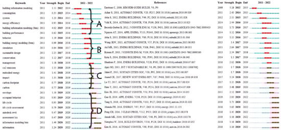 By using “Burst Terms” from the CiteSpace research literature, the keywords that used to be studied, the developing ones, and those emerging ones are obtained, as shown in Figure 10. The higher the strength of the keyword, the more attention it will receive from researchers within the time interval marked red in the figure, reflecting the research frontier and hot spot of BIM technology in the field of building energy consumption from 2011 to 2022. The timeline view shows how keywords have evolved through time and how they have coexisted with different words. At the same time, “Burst articles” can also describe the hot areas in the field of research throughout a specific time period. Therefore, this paper combines the “burst terms” with the “burst articles” to better summarize some important issues in the application of BIM technology in building energy consumption. In this study, keywords are clustered by time and divided into four categories. Further discussion is as follows.