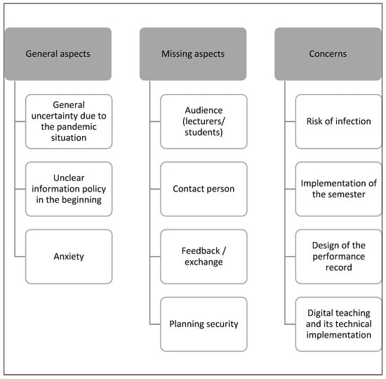 This topic describes which aspects led to students and teaching staff feeling uncertainty during the COVID-19 pandemic, as well as the change in teaching conditions. Three main categories were created and divided into different subcategories, as shown in Figure 2 below.