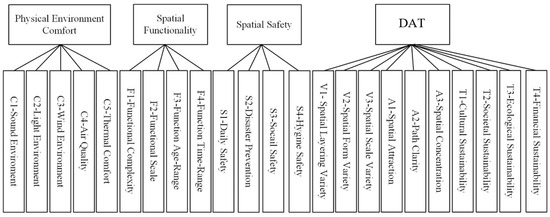 Finally, six categories, i.e., physical environment performance [19], spatial functionality [22,25], spatial safety [28,39,40], spatial diversity [25,29], spatial accessibility [29,39,40,41], and spatial sustainability [19,27,28,44,45,46,47,48], and 24 sub-items were extracted (Table 2).
