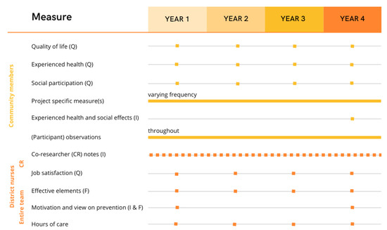 Impact measurements of collective prevention projects. Note: Q = questionnaire, I = Interview, F = focus group. CR = Co-researchers: the district nurses who have an active role in the development of the prevention projects.