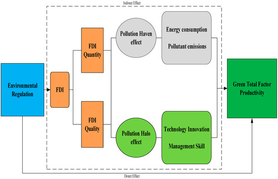 Additionally, China is diligently practicing the opening strategy; therefore, inflow of foreign direct investment increased dramatically by 20% in 2021 over 2020, reaching a record of 179 billion dollars [12]. However, the effect of FDI on environment is still puzzled. Existing literature has shown evidence that FDI exerts a dual influence, which is either a “Pollution hallo” or a “Pollution haven”, on China’s ecological quality [13]. In most studies, indicators representing the quantity of FDI are used as proxy variables for FDI, such as FDI inflows [14], FDI stock or per capita FDI inflows [15], rather than FDI quality. Meanwhile, strengthening ER significantly affects the FDI inflows [16]. In such an instance, it is as a result of such countries practicing either a “Race to the top” or “Race to the bottom” approach. In the former, local governments in an effort to attract clean industries tighten environmental regulations. In the latter, environmental regulations are laxed for the sake of improving economic development. This results in dirty industries moving into such zones to intensify pollution. The Chinese government has begun to focus on the quality of foreign investment rather than the quantity. In view of this, the following research questions are presented sequentially: does ER expand China’s GTFP through the intermediary role of FDI and is it more effective to focus on the quality of FDI rather than the quantity?