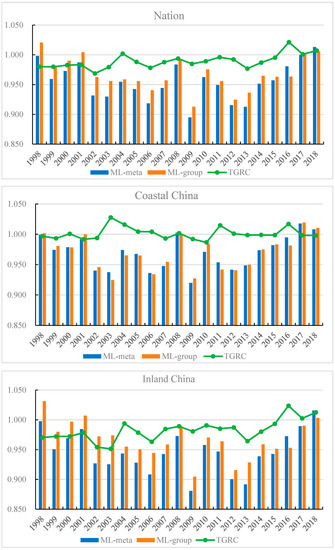 This study further compared the ML-meta index in coastal area and inland area (see Figure 2). It showed that coastal area had the largest ML-meta index (0.969) during the sample period, followed by inland area (0.947). Additionally, the TGRC index in coastland was greater than that in inland, implying that the actual production technology in coastal provinces was closer to the potential optimal technology level than inland provinces. From 2013 to 2018, the ML-meta index in inland area increased at the rate of 2.64%, which is faster than that in the coastal area (1.22%). It indicates that there a convergence characteristic of GTFP growth in China might exist.