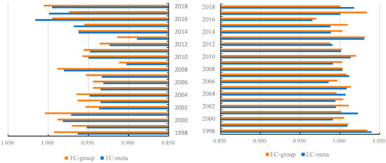 In Figure 3, the trends of ML, EC and TC indexes under metafrontier and group frontier are compared. It depicts that the average EC group was larger than EC meta. Additionally, in most periods, the EC index was obviously larger than the TC index under the corresponding production technology set. The average EC index with respect to metafrontier was 1.003 and remained stable from 1998 to 2018. It indicates that the China had optimal production factor allocation. Regarding the TC index, the average value of TC meta and TC group from 1998 to 2018 was 0.953 and 0.964, respectively. TC meta exceeded 1 only in the year of 2016, while TC group was larger than 1 in 2001 and 2018, implying that China achieved green technical progress in these years.