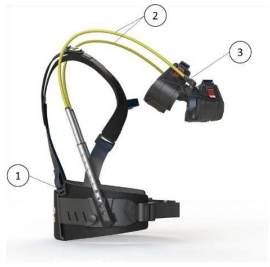 Description of Hapo MS™ exoskeleton model (Le Tellier et al., 2021 []). (1) harness; (2) springs; (3) double-interface.