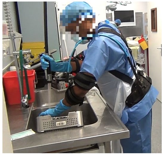 Thus, healthcare workers have been rarely concerned with physical assistance dedicated to the prevention of MSDs. Only few studies have been carried out on the impact of upper limb exoskeletons, particularly under field conditions into a hospital environment []. However, although this latter study was performed in a hospital environment, it focused on the surgeon during an operation. Thus, the aim of this study is therefore to analyse the influence of wearing an upper limb exoskeleton on healthcare workers during a task with high repetition, which reflects their biomechanical solicitation, i.e., a surgical tool cleaning task. The primary hypothesis is that the upper limb exoskeleton may decrease the activity of muscles involved in this task. The secondary hypothesis suggests that using an upper limb exoskeleton may increase the muscular activity of back muscles, as showed in the literature.