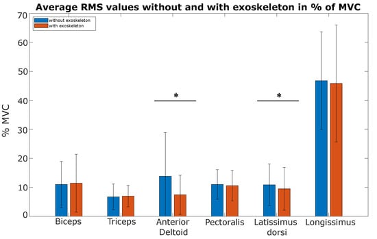 Comparison of mean RMS values between the two conditions (with and without exoskeleton) in pourcentage of MVC. Significant differences (p-value < 0.05) denoted by *.
