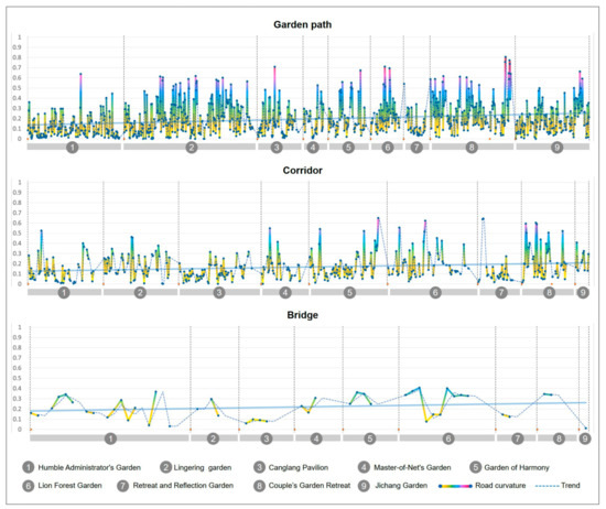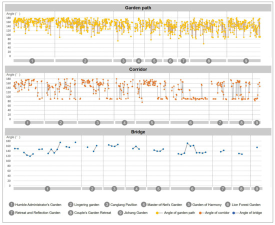 The table below renders the original data and statistics of the researchers on the road curvature, garden roads, corridors, and bridges of Jiangnan classical gardens. There are numbers on the corresponding floor plan in the statistical table, which represent the corresponding position of the data statistics.