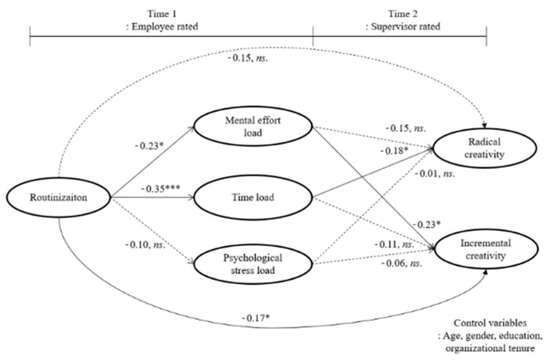 The hypothesized model for routinization and creativity with structural model parameter estimates. Thicker lines represent statistically significant results. Dotted lines represent statistically nonsignificant results. ns = not statistically significant, *** < 0.001, * < 0.05.