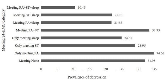 Among boys, the three groups with the lowest prevalence of depression were, in order, the meeting PA + ST + sleep group (9.43%), the meeting ST + sleep group (21.15%) and the meeting PA + sleep group (22.68%). Among the girls, the three groups with the lowest prevalence of depression, in order, were the meeting PA + ST group (11.11%), the meeting PA + sleep group (212.50%) and the meeting ST + sleep group (19.56%).