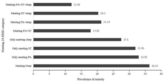 Among boys, the three groups with the lowest prevalence of anxiety were, in order, the meeting PA + ST + sleep group (7.55%), the meeting ST + sleep group (22.44%) and the meeting PA + sleep group (23.71%). Among the girls, the three groups with the lowest prevalence of anxiety were, in order, the meeting PA + sleep group (9.8%), the meeting ST + sleep group (21.22%) and the meeting PA + ST + sleep group (21.43%).