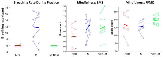 | Average breathing rate during practice | 6.0 (0) | 6.0 (0.2) | 11.9 (3.9) | 11.7 (5.1) | 6.0 (0) | 6.0 (0) |