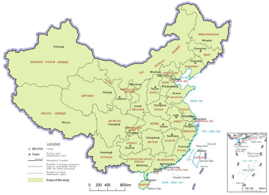 This study covered 2844 county-level regions in China in 2020. The 2844 county-level regions comprised 973 municipal districts, 388 county-level cities, 1312 counties, 117 autonomous counties, 52 banners and autonomous banners, and 2 county-level forest areas and special zones. The scope of the study did not include Hong Kong, Macao and Taiwan in China (Figure 1) because these areas adopt different data statistics methods and different management models of county-level regions than other areas in China. The county-level region is the third region level, according to China’s administrative division, whereas the first is the provincial-level region and the second is the prefecture-level region. Therefore, this study focused on the county level as a research unit, which ensured the research results would have a fine degree of detail.