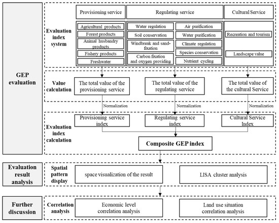 In this study, a comprehensive GEP evaluation system was constructed to evaluate the value of the ecological products of China’s county-level regions based on the existing GEP-related accounting system. The results were analysed after the evaluation, including the LISA clustering, to reflect the spatial distribution of the findings; a correlation analysis was also used to study the correlation between the results and the associated economic levels and land use situations. The overall roadmap is shown in Figure 2.