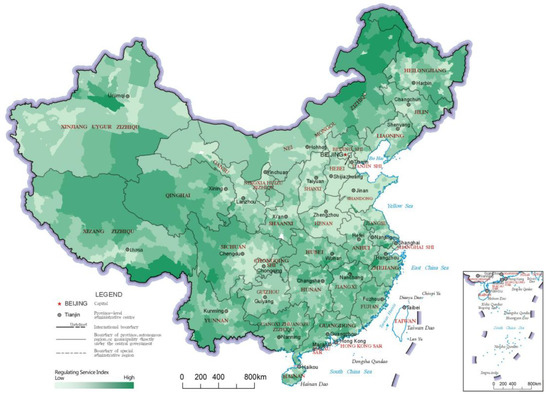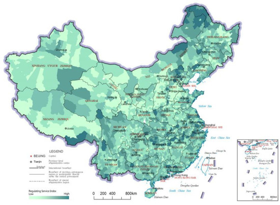Distribution map of regulating service indices of the county-level regions in China.