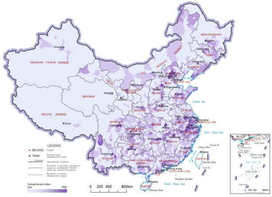 Distribution map of cultural service indices of the county-level regions in China.