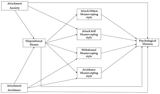 Dispositional shame and shame-coping styles will be serial mediators in the relation between attachment insecurity and psychological distress. We posit that higher attachment anxiety will be associated with higher distress via higher dispositional shame and then greater use of the attack self shame-coping styles and a higher attachment avoidance will be linked with higher distress via higher dispositional shame and the greater use of withdrawal and the avoidance shame-coping styles.