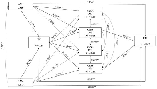 Serial mediation model (n = 978). Standardized parameter estimates are reported. To ease the interpretation, covariates and non-significant paths/correlations are not shown. ASQ = Attachment Style Questionnaire; ANX = attachment anxiety; AVD = attachment avoidance; ESS = Experience of Shame Scale; CoSS = Compass of Shame Scale; AO = attack other; AS = attack self; WD = withdrawal; AV = avoidance; K10 = Kessler psychological distress scale. * p < 0.01. ** p < 0.001.