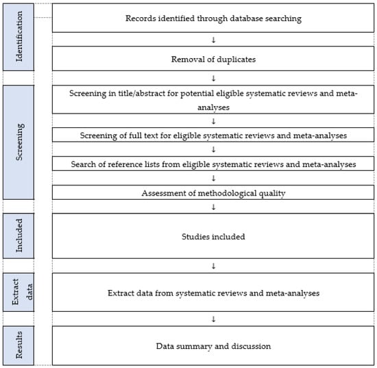 - Aromataris, E.; Fernandez, R.; Godfrey, C.M.; Holly, C.; Khalil, H.; Tungpunkom, P. Summarizing systematic reviews: Methodological development, conduct and reporting of an umbrella review approach. Int. J. Evid. Based Healthc. 2015, 13, 132–140. [Google Scholar] [CrossRef]