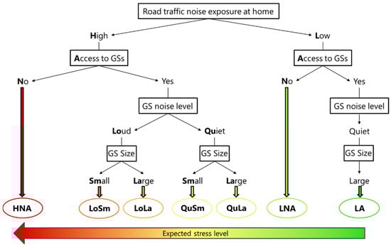 Classification of the seven study groups accounting for road traffic noise exposure at home in combination with access to GSs of varying sizes. The stress level is expected to increase from right to left.
