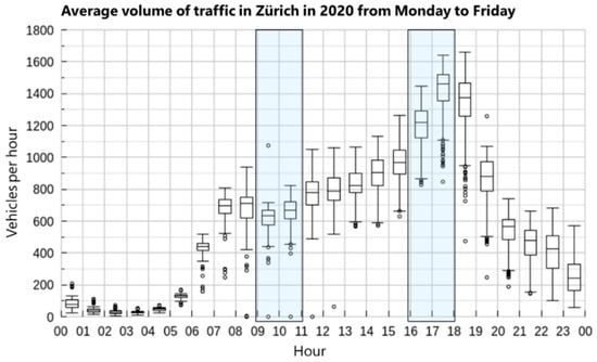 Average daily road traffic counts (vehicles per hour) at a measurement location in central Zurich in the year 2020 with the hours where the measurements took place highlighted. Source of data: City of Zurich (2021).
