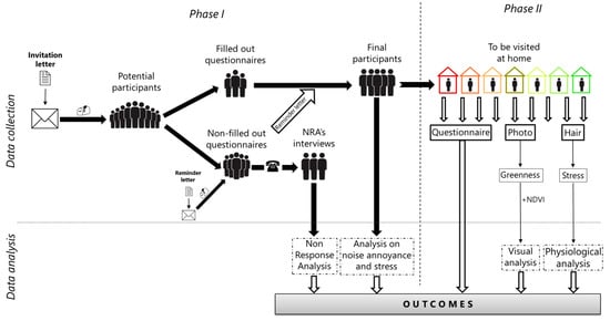 Inhabitants of the study sites are considered suited for participation if they lived for at least one year at the same location and are at least 18 years old. Data collection is performed in two to three waves, with an optional third wave in case of lower-than-expected participation. Potential participants are contacted by letter and invited to participate in an online field survey. They are also invited to contribute to a participatory geographical information system (PGIS) process to identify a point within their most visited GS (see “Phase I” below). In the second step, a subsample of participants are visited at home to collect hair cortisol and cortisone probes to analyze long-term physiological stress, take photos from their living room windows and ask questions about the perceived soundscape and view from home. For this subsample, additional exclusion criteria apply (see “Phase II” below). Furthermore, a non-response analysis (NRA) interview is carried out by telephone to address potential bias (see “NRA” below). The two-step approach, i.e., split into two different phases (Phase I–II), is performed as indicated in Figure 3. Study participation is voluntary.